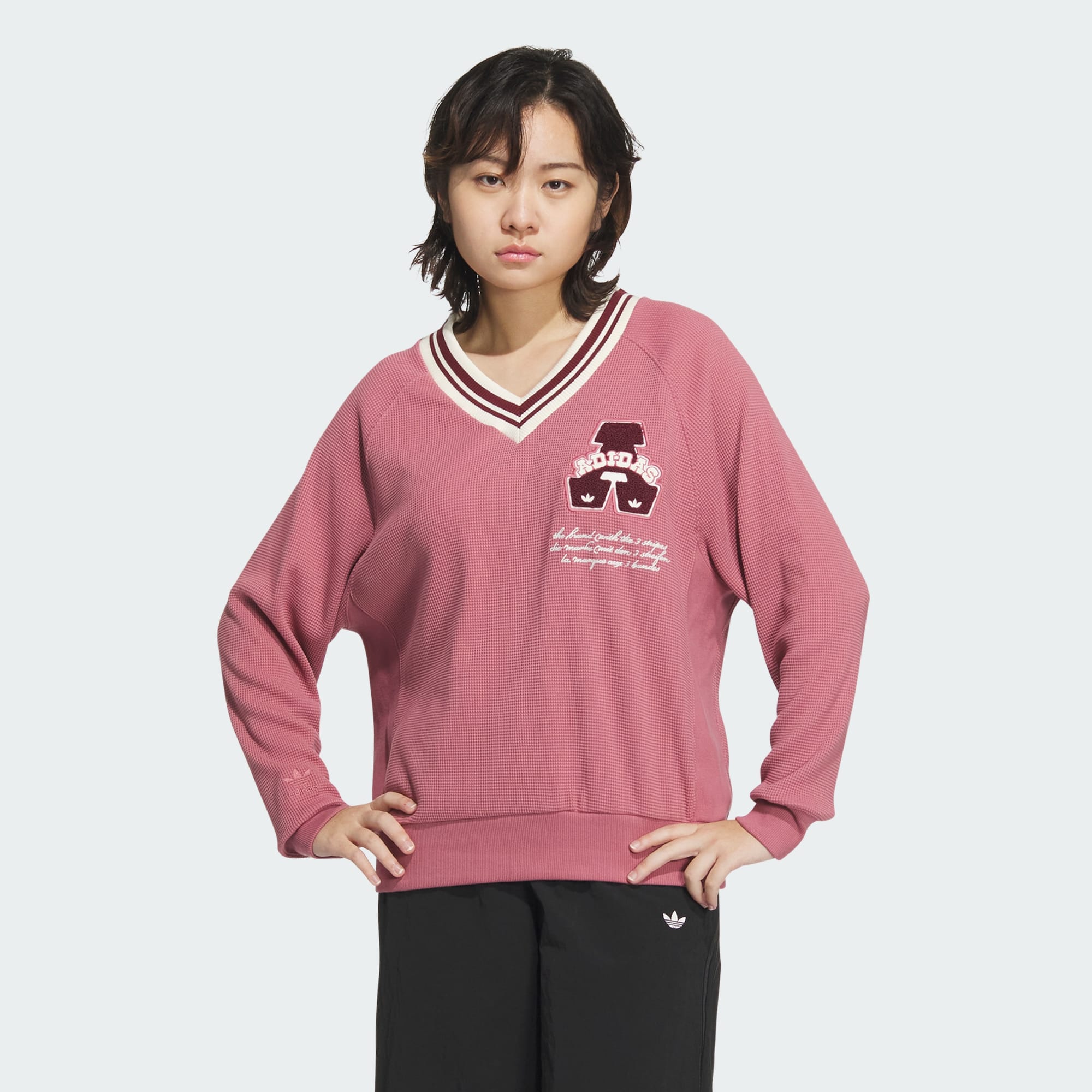 Give your look the old college try in this collegiate-inspired V-neck sweatshirt by adidas Originals. Cut loose for roomy comfort, it features a waffle-knit construction and the ultra-soft feel of cotton and polyester viscose fabric. Ribbing on the cuffs and hem keep the fit snug where it counts, while the striped V-neck collar and the large, collegiate graphic bring to mind classic sweatshirts. Tap into the brand's timeless sport heritage while scoring an easy A in Street Style 101.