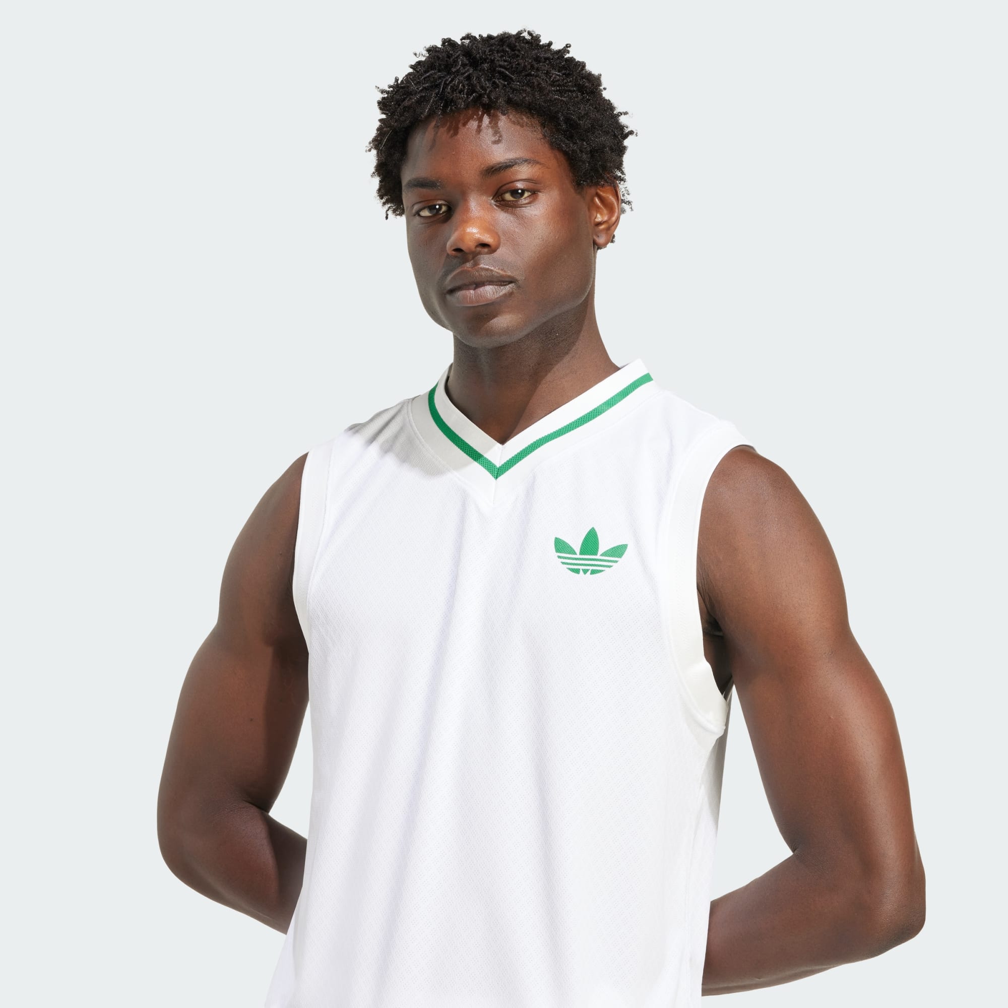 A white and green Adidas logo is prominently displayed on a white, patterned fabric in the foreground.
