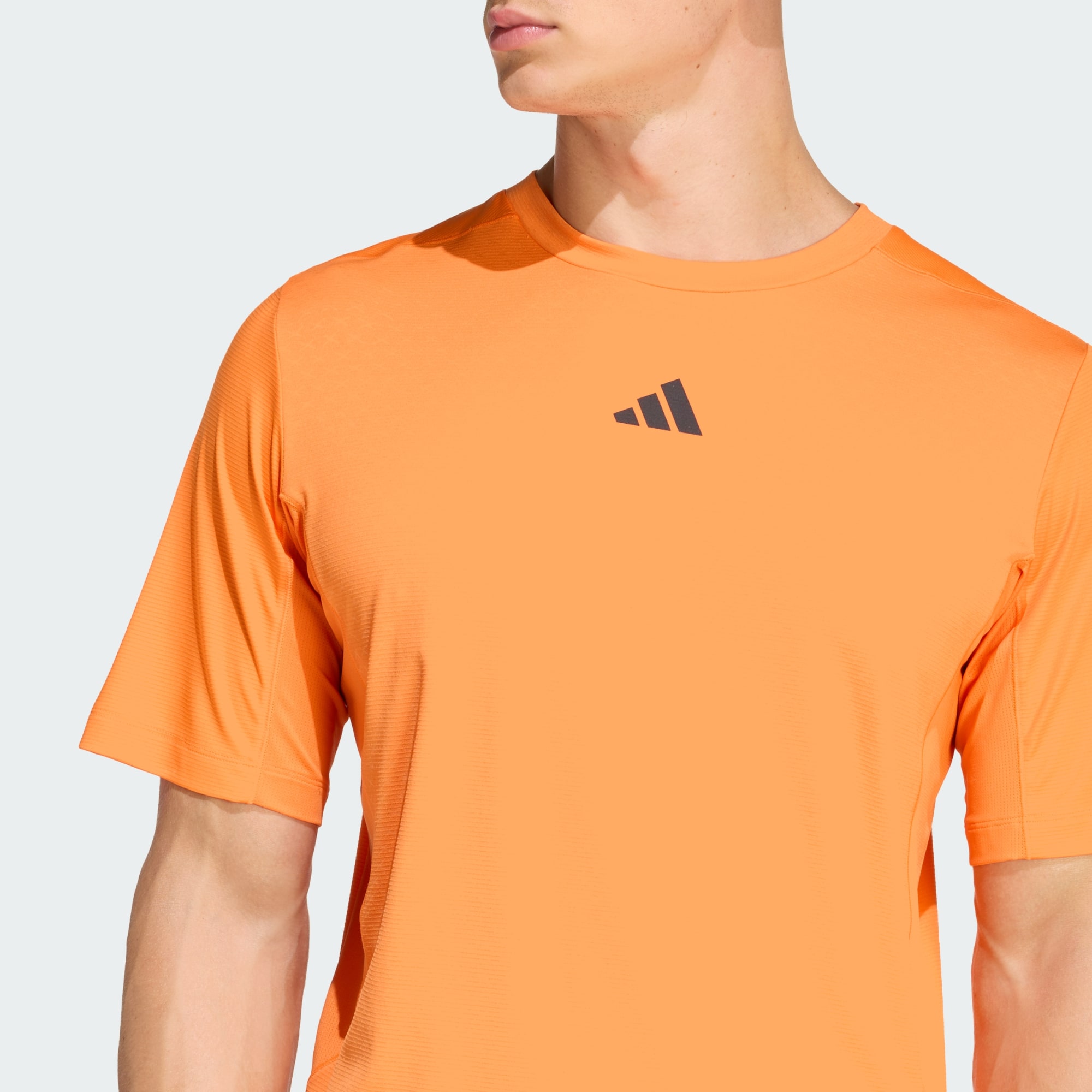 Chiếc áo thể thao màu đen với họa tiết sần và logo adidas nổi bật ở mặt trước, trên nền trắng trơn.