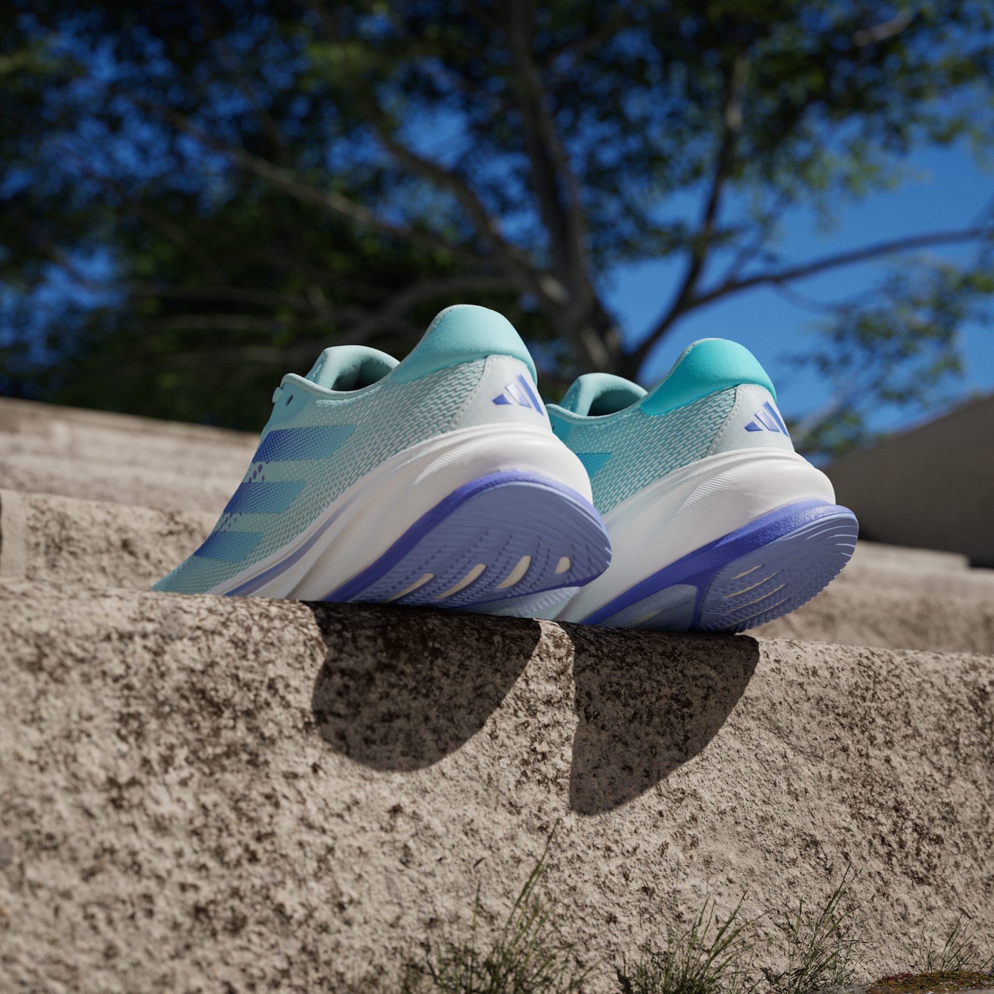 A close-up of the technology of the blue and turquoise adidas Supernova Rise running shoe.