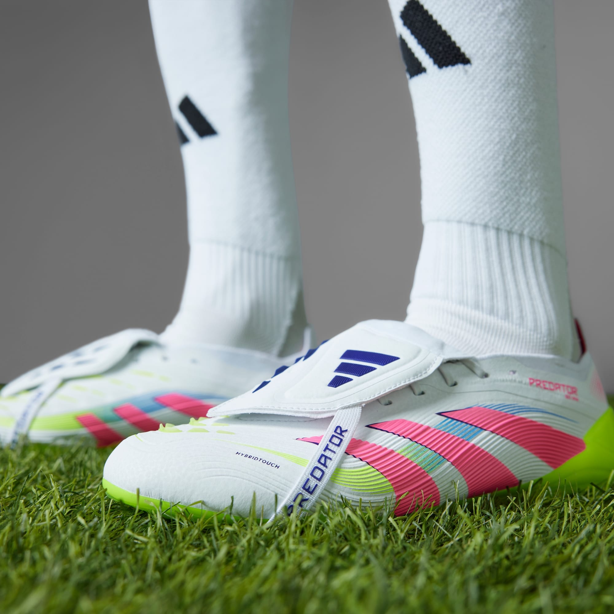 A close-up view of a white and pink soccer cleat with the "Predator" logo, set against a dark green background.