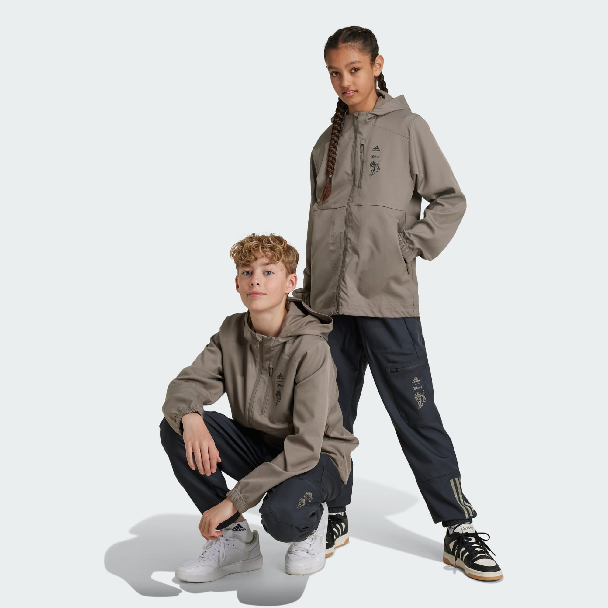 Three children walking across a bench followed by Lion King shadows, wearing the adidas | Lion King collection.